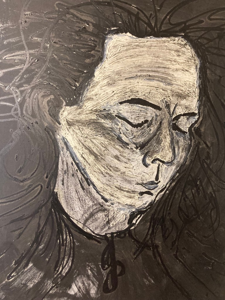 She was sleeping, not peacefully, but she was sleeping. I poured ink on her. I knew it would hurt her. I knew I wouldn’t be able to take it back. I did it anyway. I rubbed it in her hair. I rubbed it inter her creases. I cannot wipe it clean. Today, I will buy more paint and rebuild her. I didn’t see that need when I ruined with purpose, but I cannot look at her without hurting a lot.